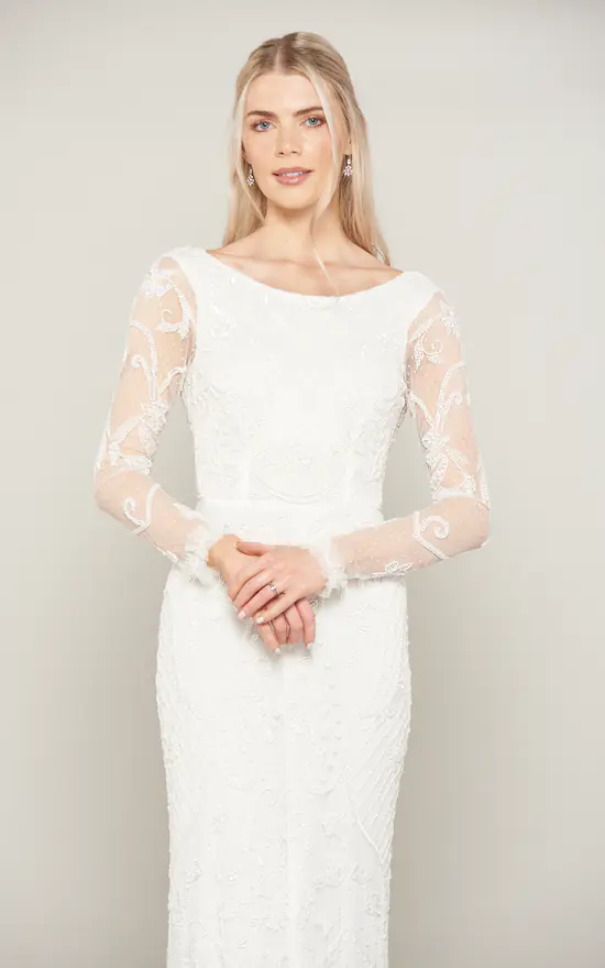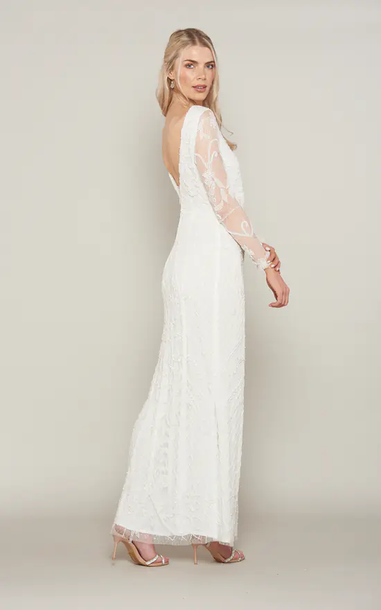 Overlaid with lace and hand embellished with sequins and beads, this Amelia Rose maxi dress is an elegant choice for your special day. This long white gown is designed with a plunging v neck back and sheer full length sleeves.