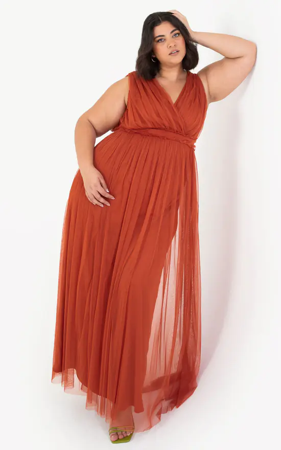 At Anaya with Love each item is consciously designed and made with 100% recycled fabric so you can look great and do good. A simple cut in a showstopping shade forms an elegant dress perfect for Autumn events. Crafted from recycled tulle gathered into a strappy, faux wrap bodice with a classic V neckline and a contrasting satin waistband with frill detailing. Signature floor sweeping skirt and invisible zip fastening add to the refined look.