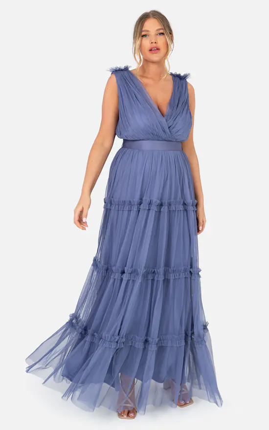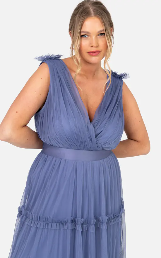 Catering to all body shapes this elegant maxi dress is a stylish choice for all occasions. In a graceful Iris Blue shade this gathered tulle gown features a faux wrap bodice creating a beautiful v neckline at the front and back of the dress so you can accessories with ease. A-line silhouette of the maxi skirt is a classic Anaya statement and the intricate gathered detailing creates a voluminous skirt ready to twirl in. Letβs not forget about the ruffle shoulder that perfectly matches the skirt and satin waist sash that compliments the whole look.