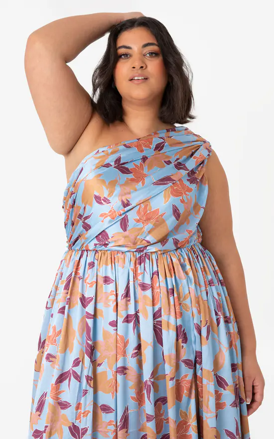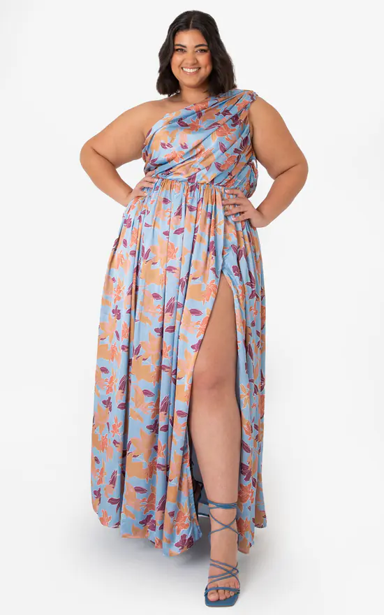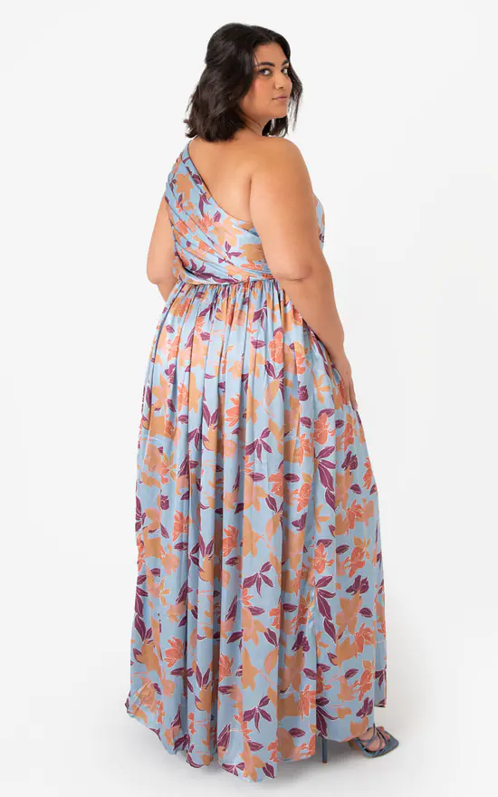 At Anaya with Love each item is consciously designed and made with 100% recycled fabric so you can look great and do good. Step into natures most mesmerising season with contemporary silhouettes and daring thigh-high splits. Asymmetric shape on the bodice creates a stylish diagonal neckline with lightly gathered fabric creating a goddess like figure. Anayaβs signature gathered skirt forms subtle movement making the golden leaf print come to life with each step you take. Style this maxi dress with blue accessories for a fresh and modern look.