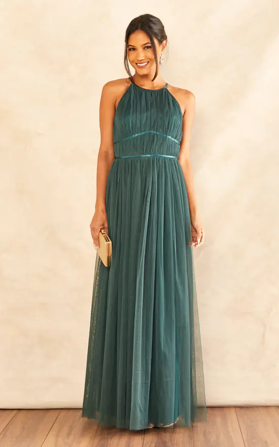 At Anaya with Love each item is consciously designed and made with 100% recycled fabric, so you can look great and do good. This emerald piece is set to astonish all event goers by its classy silhouette and refined fabric. Elegant halterneck on the fitted bodice leaves room for delicate satin ribbons on the waist and an alluring keyhole detail to the reverse adding to the romantic nature of this garment. Gathered waist lets the fabric flow into an effortless A-line silhouette with mesmerising ruffling of the hemline. Style this maxi dress with strappy heels and a clutch.