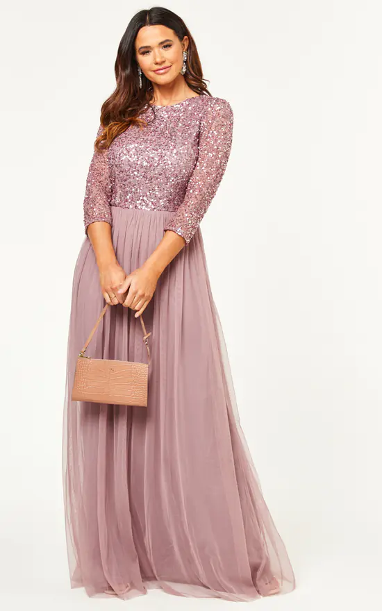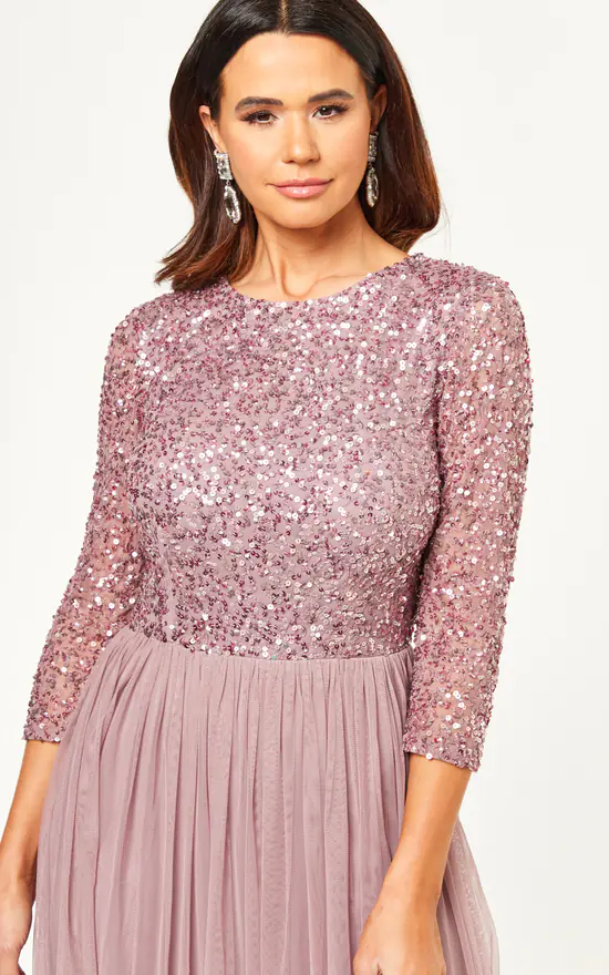 The Bridesmaid Embellished Sequin Maxi Dress in Lavender by Angeleye is a fantastic option for your event to come. Featuring cropped mid length sleeves and a maxi length tulle floating skirt. The skirt is fully lined and puffs out at the waist creating a beautiful A-line shape silhouette. Glam and sophisticated!