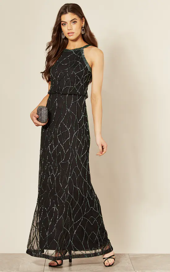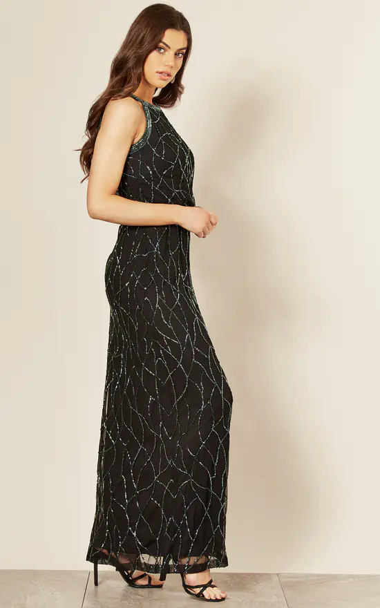 A Black maxi dress with Green sequins embellished in swirling patterns onto the dress. We love this Black embellished maxi dress, the gorgeous embellished sequins make this a perfect event dress. A black tie sequin gown for those special events!