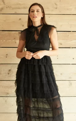 Designed with an exaggerated tulle skirt with ruffle accents, a structured bodice with ruched cups, and a crowd favorite lace-up back. Make An Entrance with this piece.