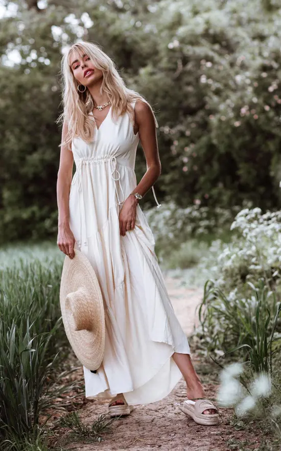 The Valance Drape Dress is a tiered V-neck maxi dress, crafted with a V-neckline and features a sleeveless design, drawstring waist fastenings, asymmetric tiered silhouette, mid-length hem, loose silhouette and V-cut detail at the back.