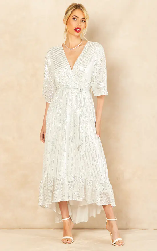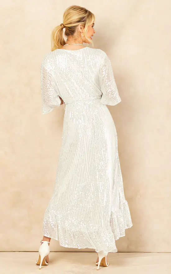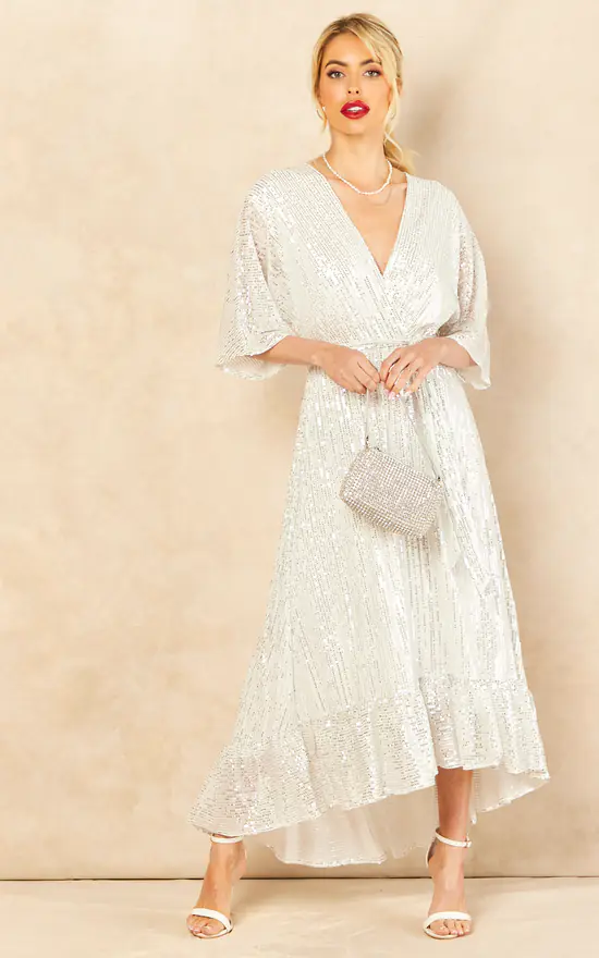 This statement maxi dress is defined by its kimono style sleeve and all over sequin detail. Some say, there’s no such thing as the perfect party dress, this sparkly number proves there is.