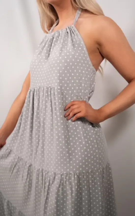Our halter tie Elasticated back frill dress with flattering flowing frills make it a must for these long summer days.