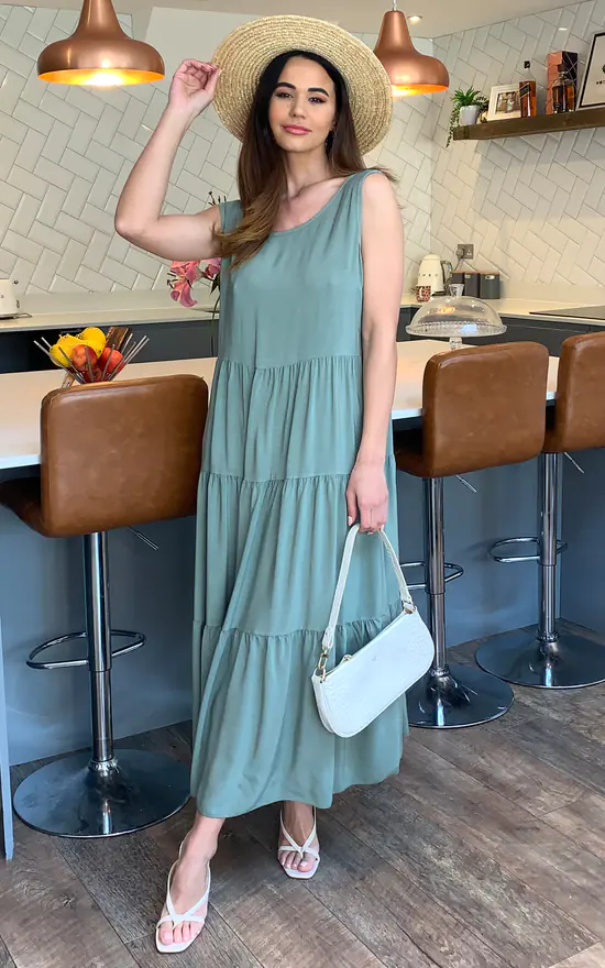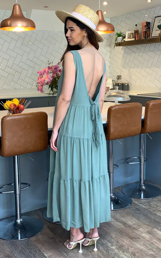 Exclusively by Blue Vanilla. Our Beatrice Tiered Smock Dress In Khaki with low back and tie detail is perfect for casual summer BBQ’s and beach days. Pair with Sandals.