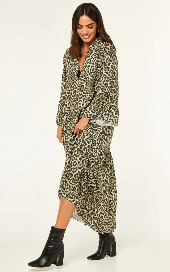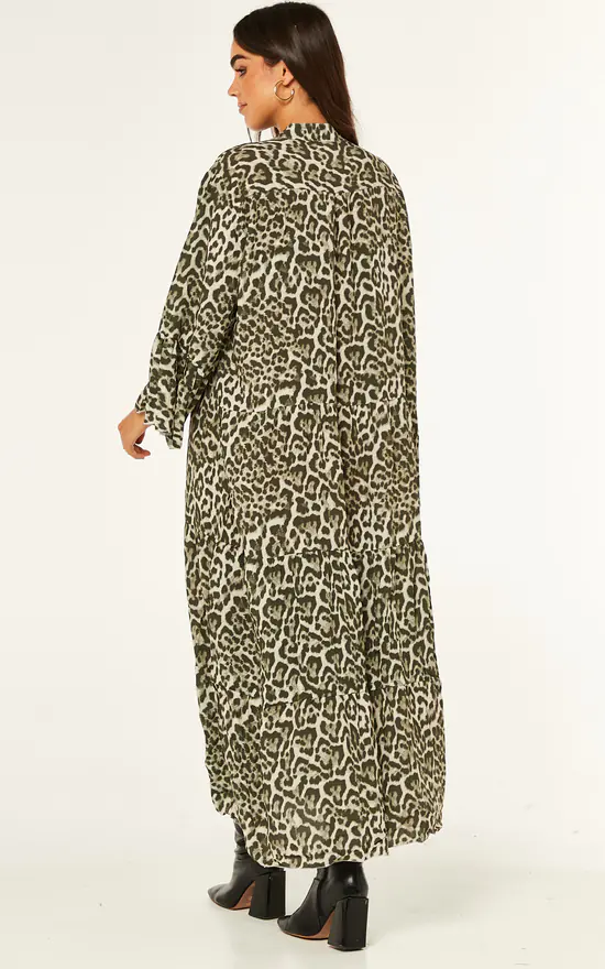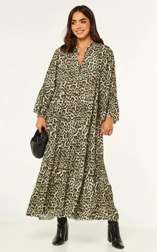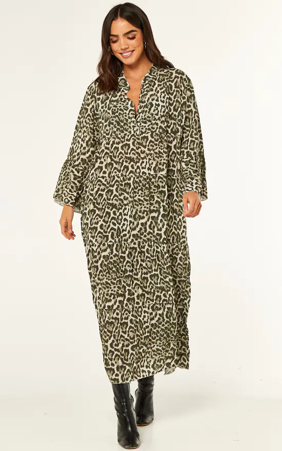 Exclusively by Blue Vanilla. Go for comfort with this timeless Millie Leopard Print Maxi Smock Dress In Khaki which makes a great wardrobe staple. Endlessly versatile, this chic number looks great wherever you wear it.