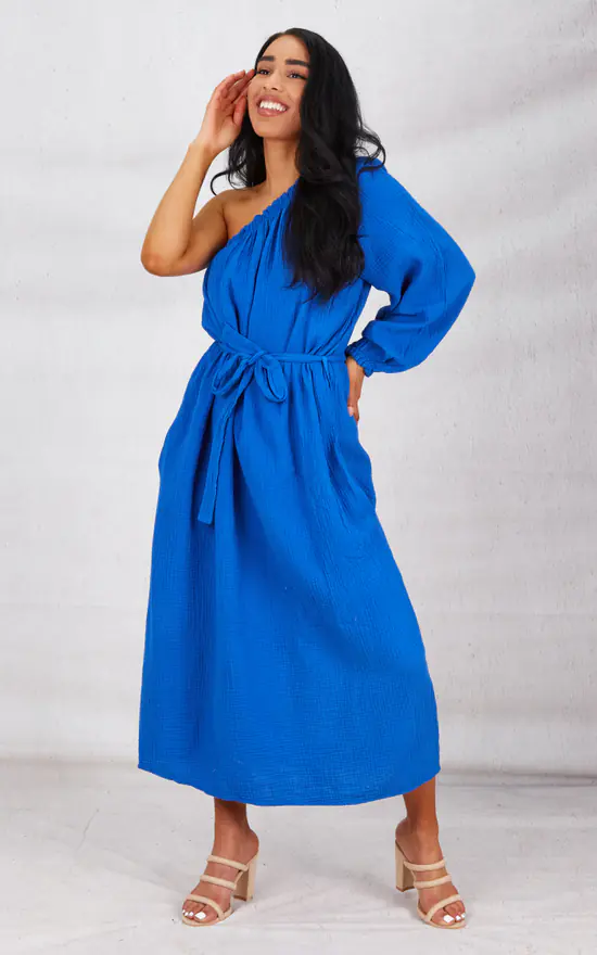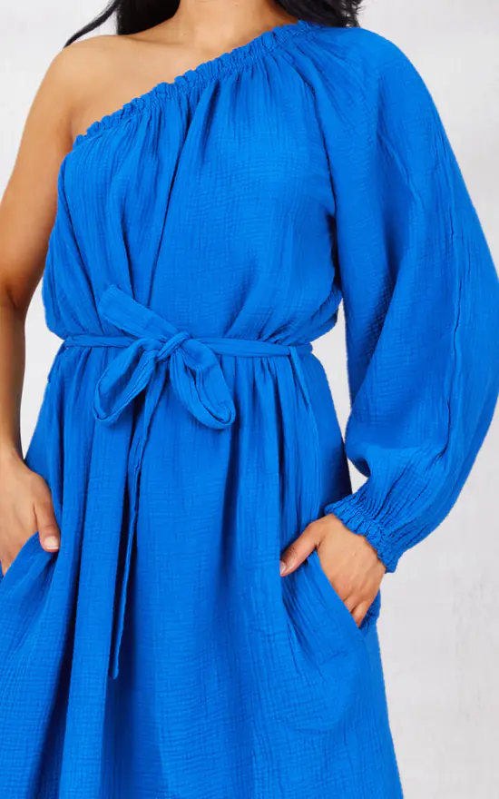 Our Blue Cheesecloth One Shoulder Side Pockets Maxi Dress is part of our latest Dress Collection. Featuring a cotton material, one shoulder, belt, side pockets and finished in a loose, flowy fit!