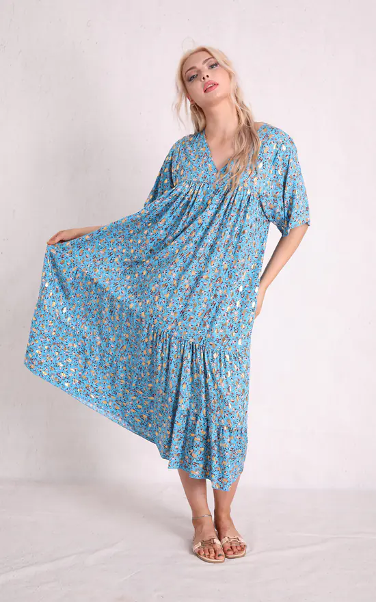 This Blue Floral V Neck Tiered Dress is part of our latest dress collection! Featuring a thin lightweight material, short sleeve, v neck, tiered detail and finishing in a relaxed fit.