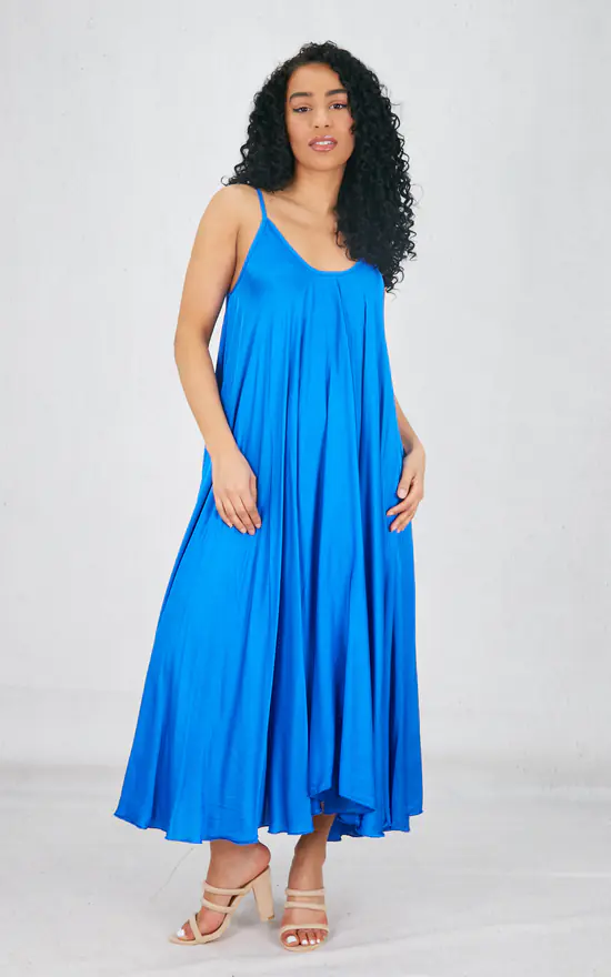 Our Blue Maxi Dress is part of our latest Dress collection. Featuring a coral silky material with a plunge scoop neckline, strappy design, maxi length in a loose flowy fit.