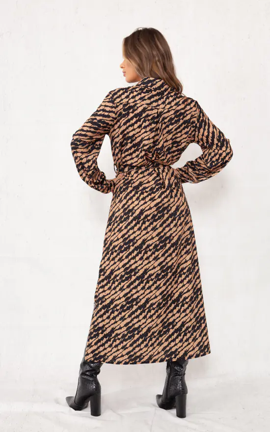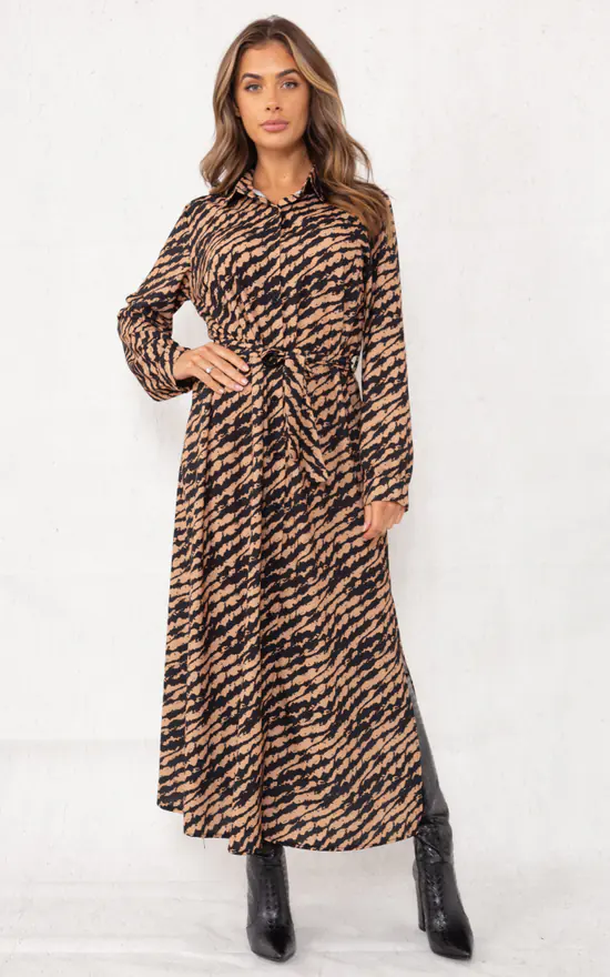 Our Camel printed maxi shirt dress is a must have for the season! Open front with button fastening, collared neck with belted detail. Soft to touch with long sleeves.