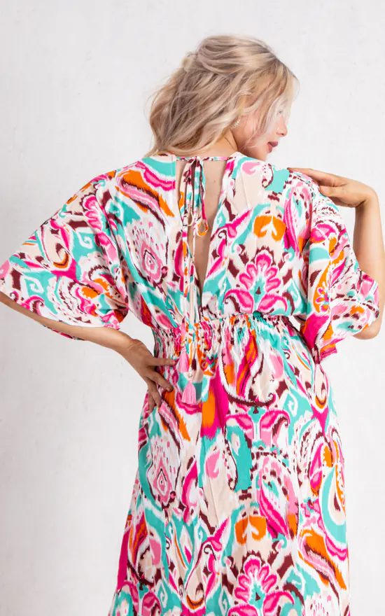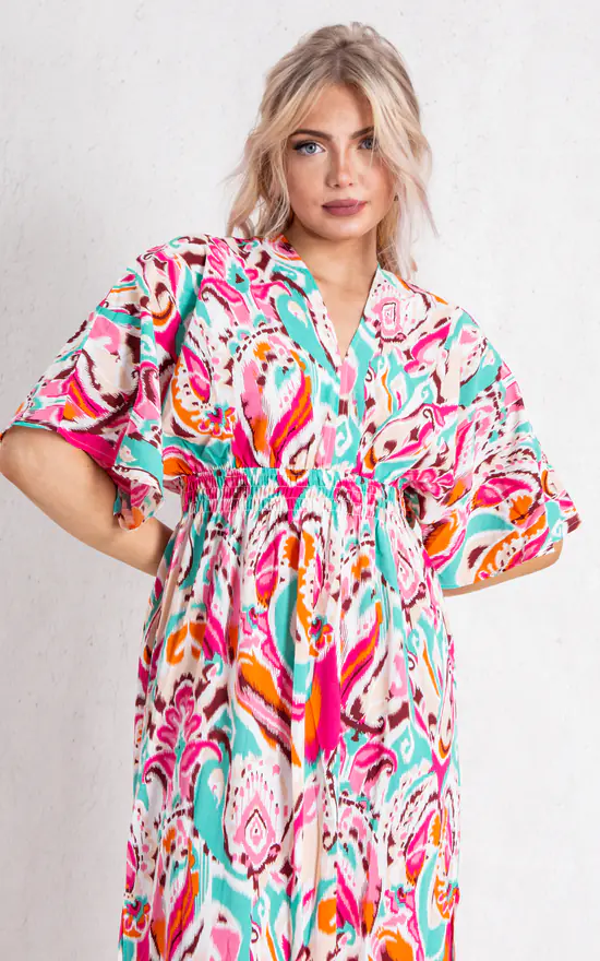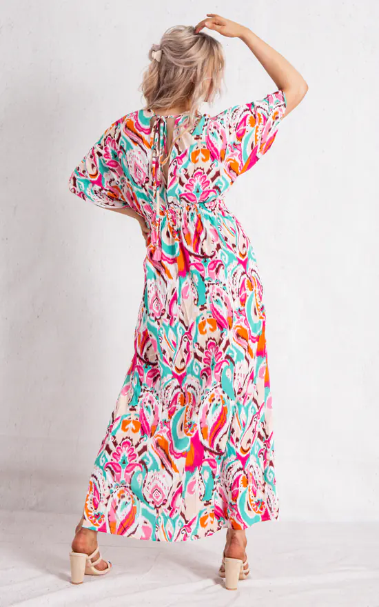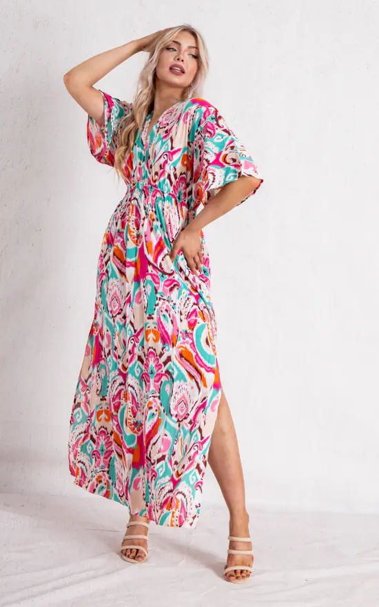 This Fuchsia Multicolour Short Sleeve Maxi Dress is part of our latest dress collection. Featuring a light weight material, short sleeve, V neck, two side split and finishing in a flowy fit.