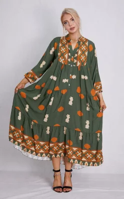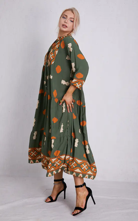 Our Green and Orange Maxi Dress is a part of our latest collection. Featuring a lightweight printed material with tiered frill detailing giving the dress a loose, flowy finish, long sleeves with elasticated cuffs and a deep V-neck.