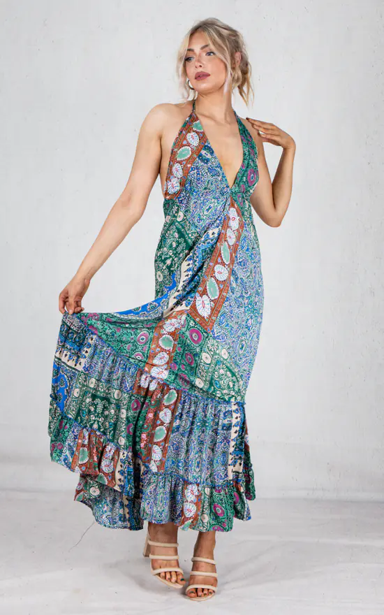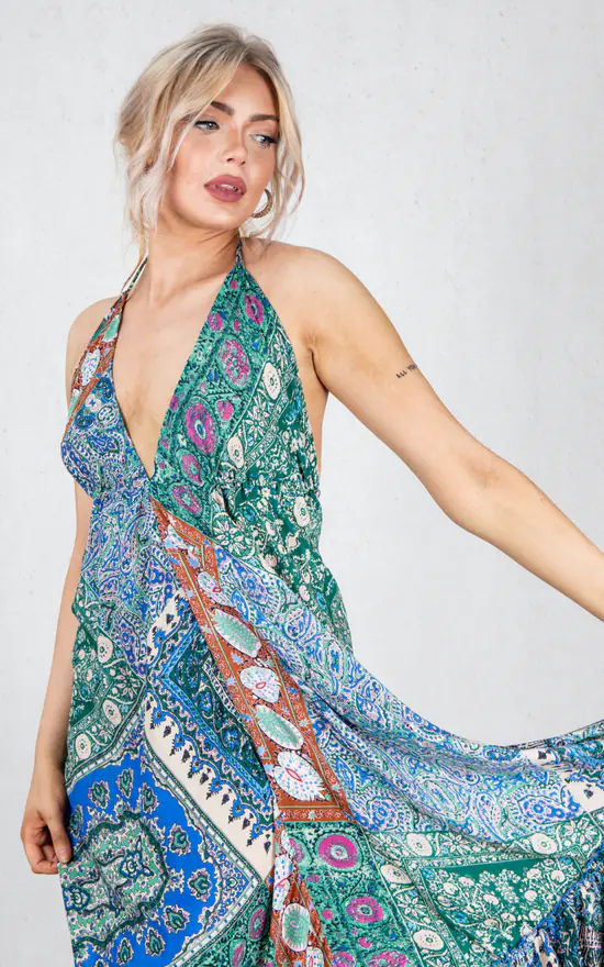 This Green Multicolour Halterneck Backless Maxi Dress is part of our latest dress collection. Featuring a lightweight satin material with deep V-Neck, backless, halterneck tie and finishing in loose maxi flowy fit.