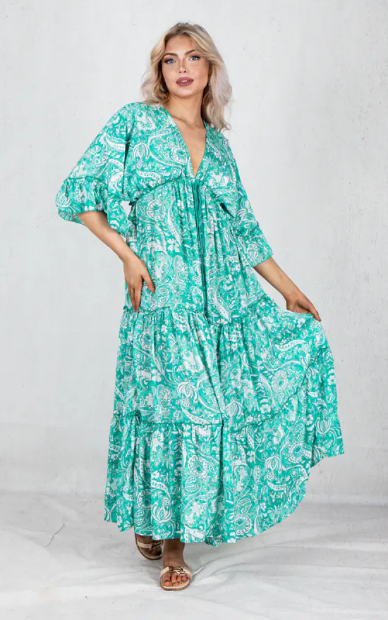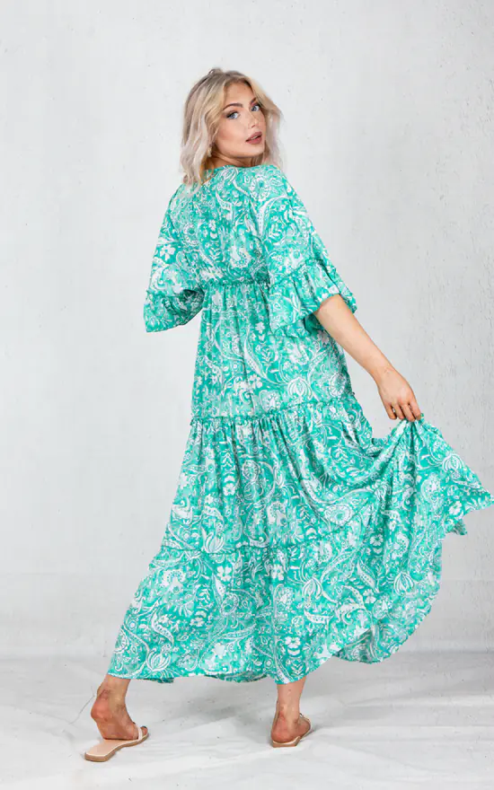 This Green Printed Tiered V Neck Maxi Dress is part of our latest dress collection. Featuring a light weight material, short sleeve with frill detail, V neck, tiered style and finishing in a flowy fit.