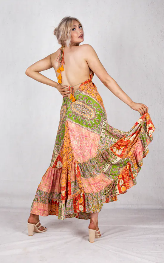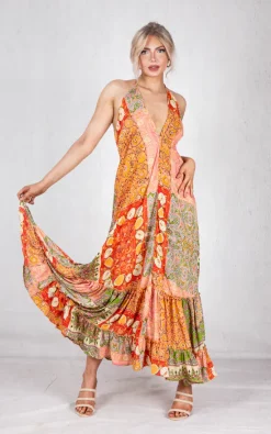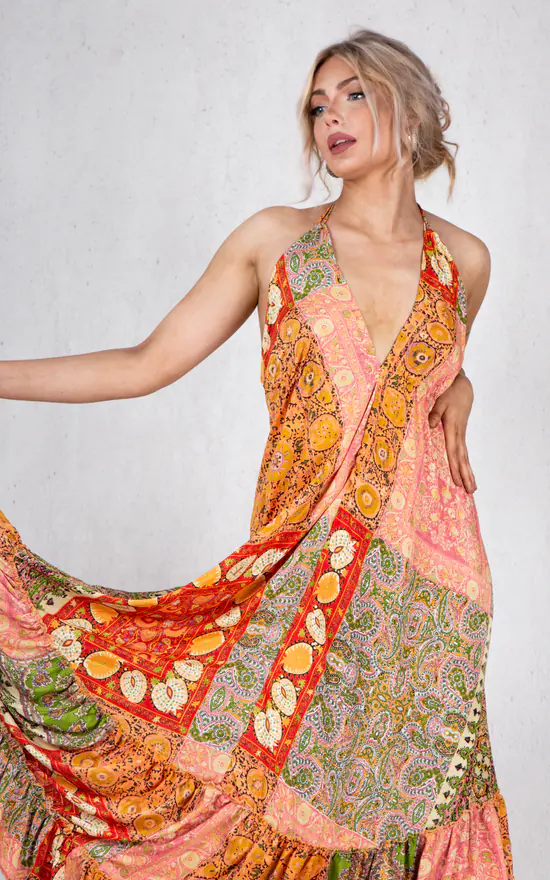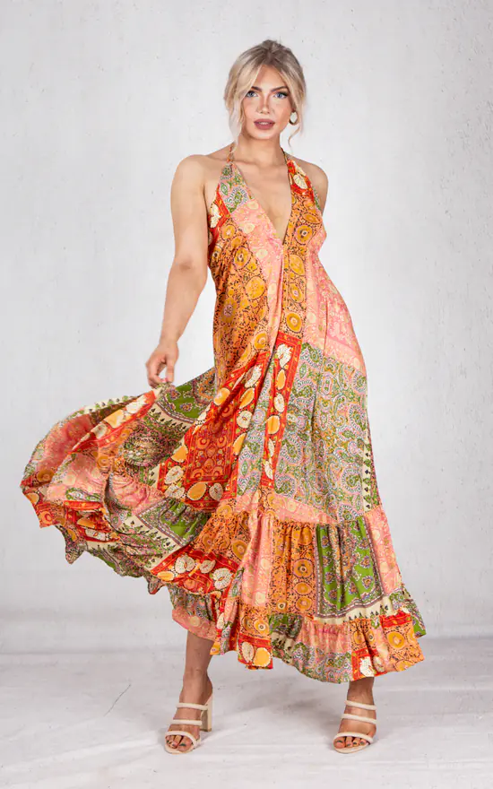 This Orange Multicolour Halterneck Backless Maxi Dress is part of our latest dress collection. Featuring a lightweight satin material with deep V-Neck, backless, halterneck tie and finishing in loose maxi flowy fit.