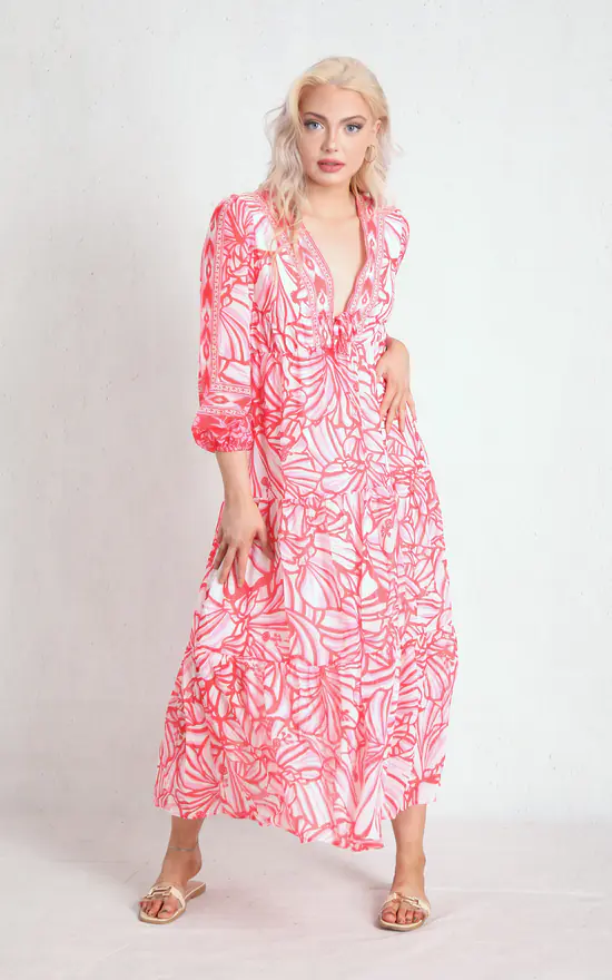 This Pink Floral V-Neck Tiered Maxi Dress is part of our latest dress collection! Featuring a lightweight material, v neck, long sleeve and finishing in a flowy fit.