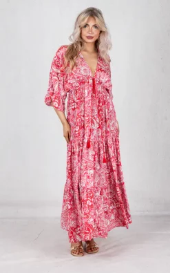 This Red Printed Tiered V Neck Maxi Dress is part of our latest dress collection. Featuring a light weight material, short sleeve with frill detail, V neck, tiered style and finishing in a flowy fit.