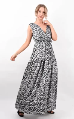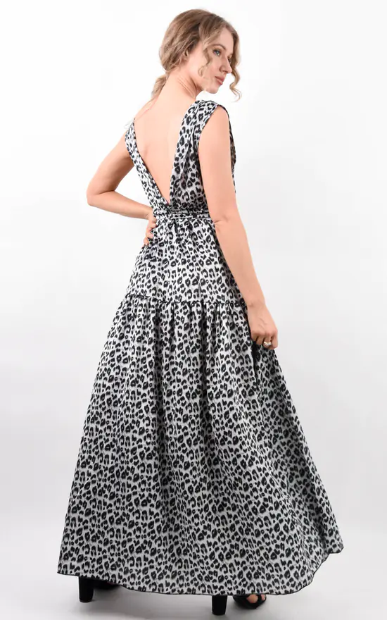 Our Satin Leopard Print Belted Maxi Dress is part of our latest Boutique Woman collection. Featuring a lightweight material in a black, grey and white leopard print with a plunge v-neckline, deep v back, elasticated waist, tie up belt, tiered detailing and sleeveless style finished in a maxi length and loose relaxed fit.