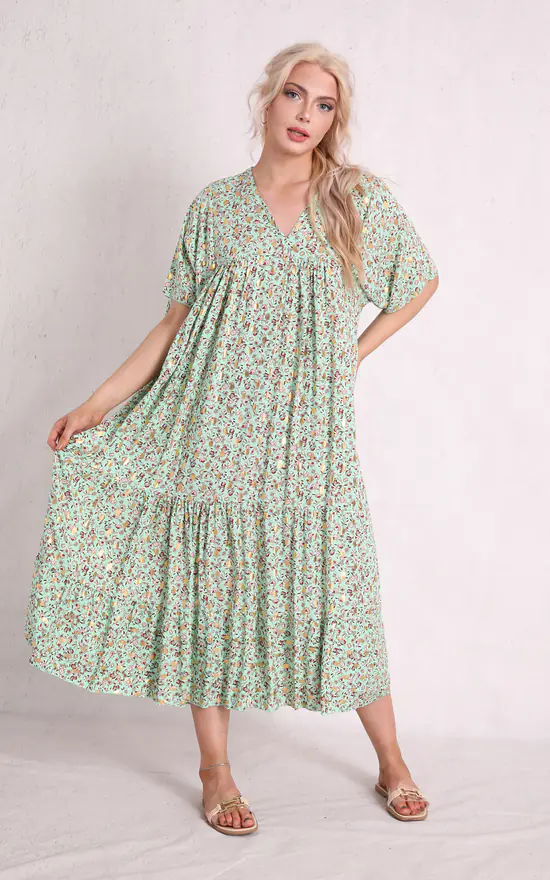 This Teal Floral V Neck Tiered Dress is part of our latest dress collection! Featuring a thin lightweight material, short sleeve, v neck, tiered detail and finishing in a relaxed fit.