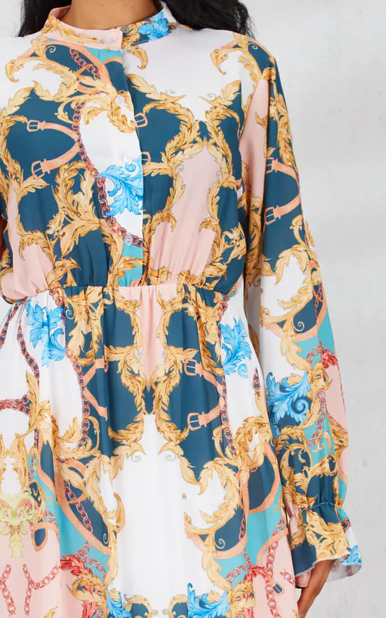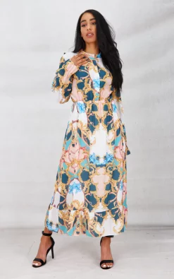 This White Printed Long Sleeve Tiered Maxi Dress is part of our latest dress collection. Featuring a tiered maxi length, a round neck, elasticated frill cuffed long sleeves and an oversized fit.