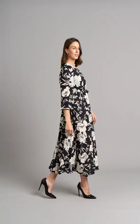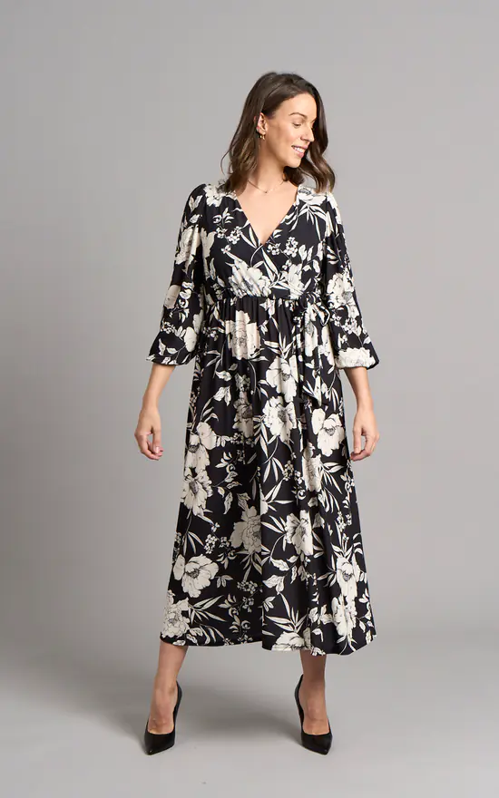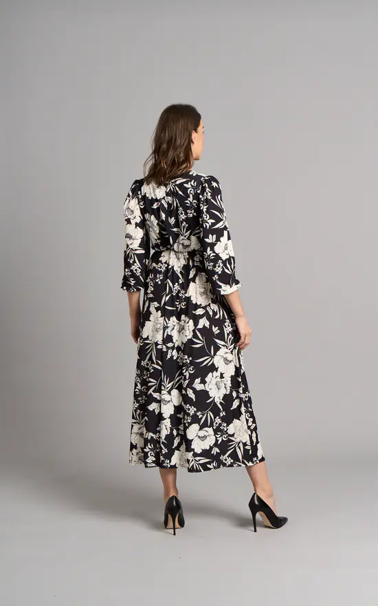 Crafted from sustainable viscose, this dress will be your new favourite this Autumn-Winter. Detailed with black and white floral print, long balloon sleeves and V-neckline this dress is timeless. The wrap style creates a beautiful shape that cinches in at the natural waist and drapes effortlessly over your curves. This classic dress will be your ultimate go-to this season!