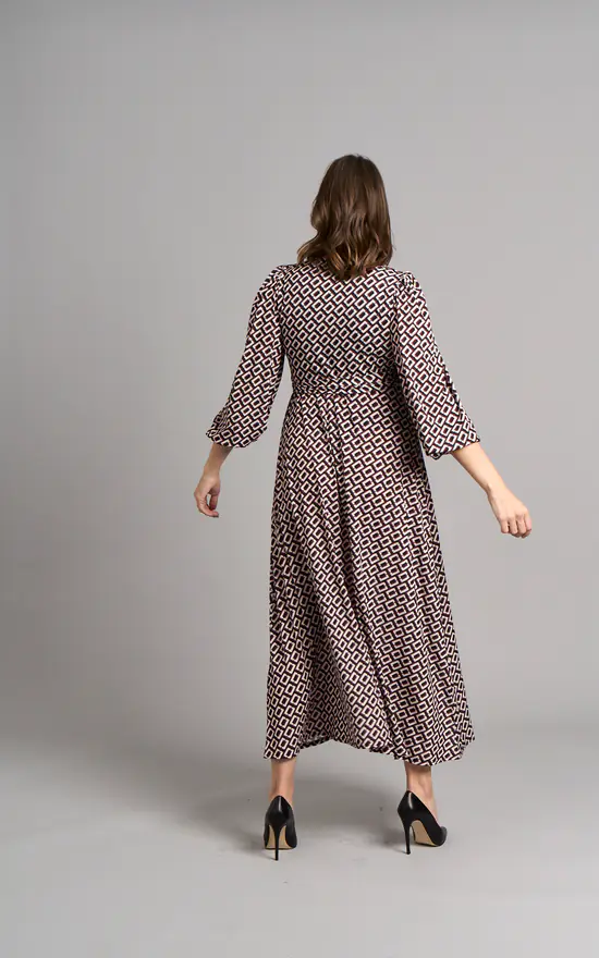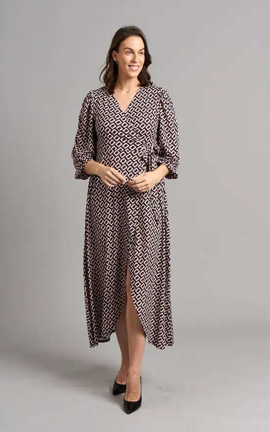 Crafted from sustainable viscose, this dress will be your new favourite this Autumn-Winter. Detailed with geometric print, long balloon sleeves and V-neckline this dress is timeless. The wrap style creates a beautiful shape that cinches in at the natural waist and drapes effortlessly over your curves. This classic dress will be your ultimate go-to this season!
