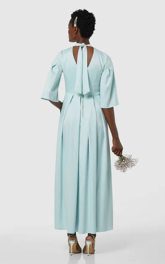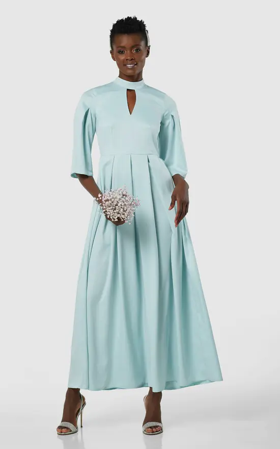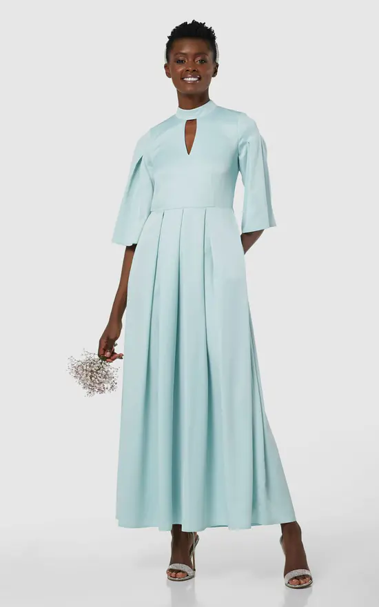 Details: High Neck, Midi, Full Sleeve, Pleated, Maxi, Wrap Neck, Full Skirt