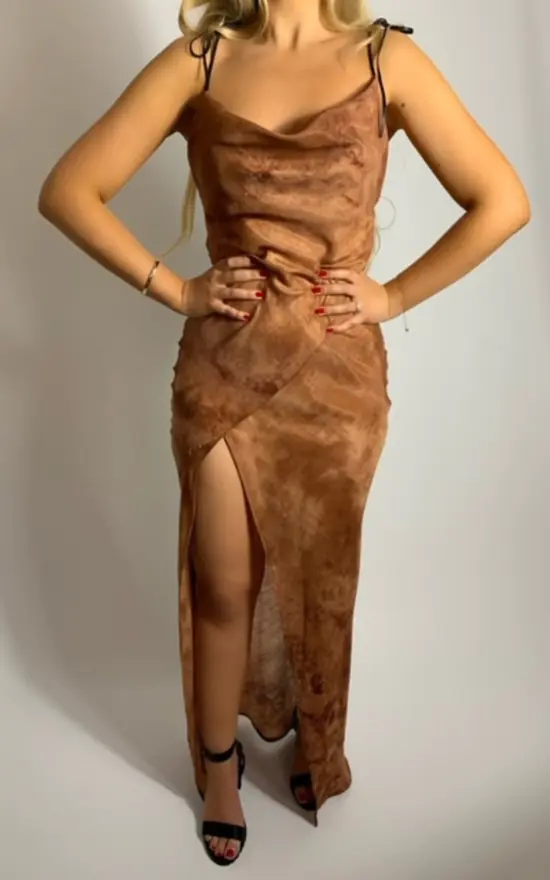 The ‘Carmen’ dress features a thigh high split and cowl neckline. It has adjustable black straps and lace up back perfect to adjust fit and comfort. Bias cut, semi fitted floor length maxi . Made in a semi sheer tie dye lightweight fabric.