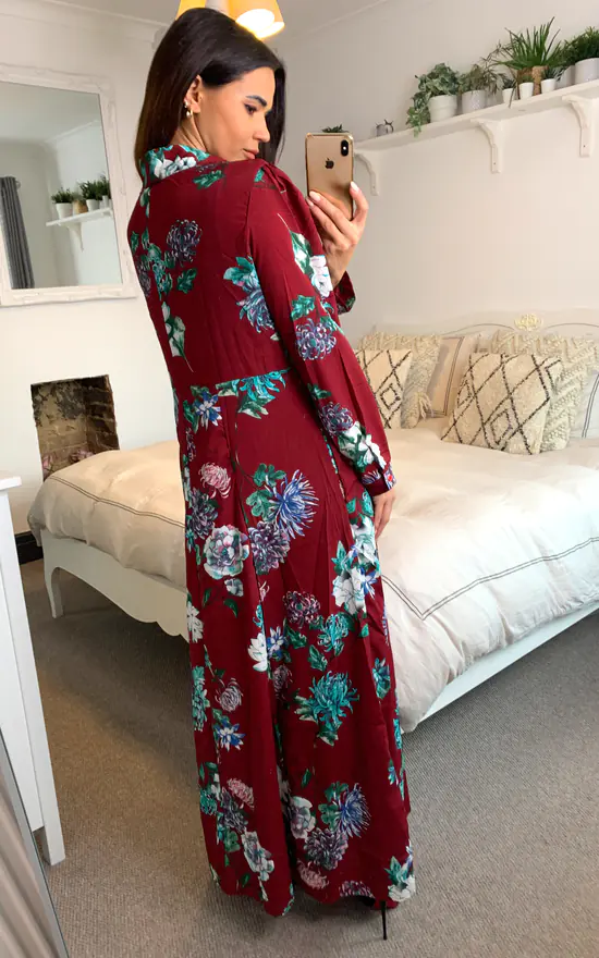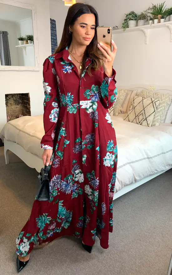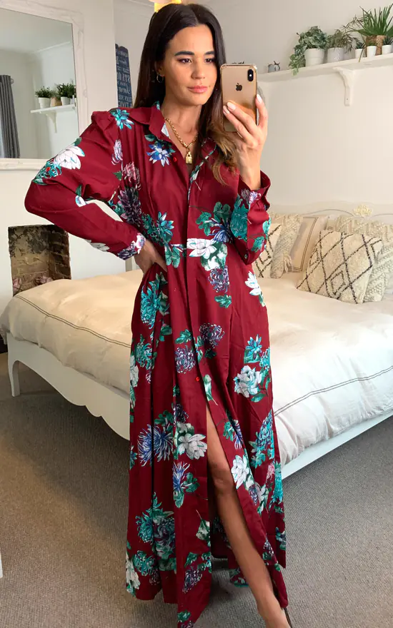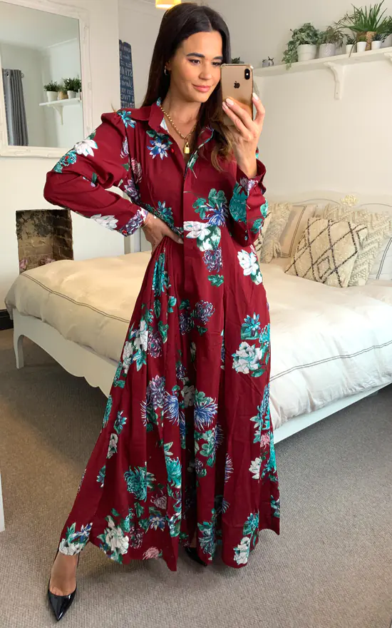 Long Sleeve Maxi Shirt Dress in Red Floral Print Features:
