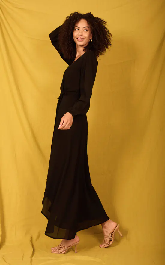 Perfect for date night and special occasions. Featuring a classic wrap shape and a flattering tie-waist, this gorgeous maxi is finished with long sleeves and a v-neckline. Made from a floaty fabric.