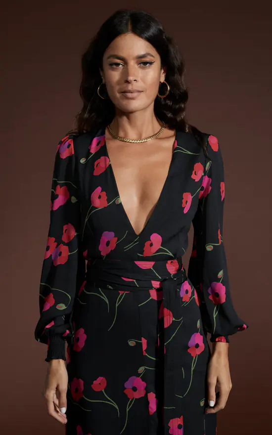 A dress worth making plans for! Features a standout neckline and striking poppy print