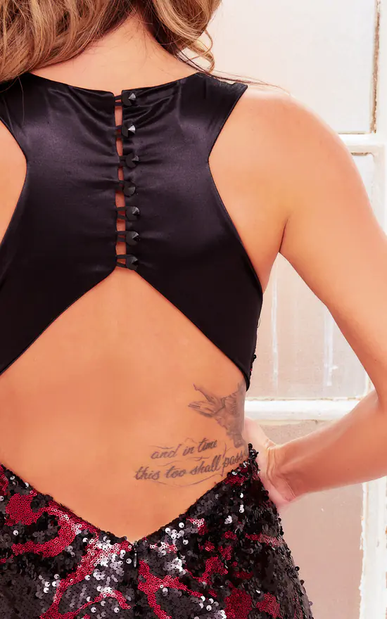 The stunning SIA gown in wine red and black comprising of a sequin bodice with a complimenting beaded chandelier trim and black soft jersey base. Fully lined bodice with zip closure.