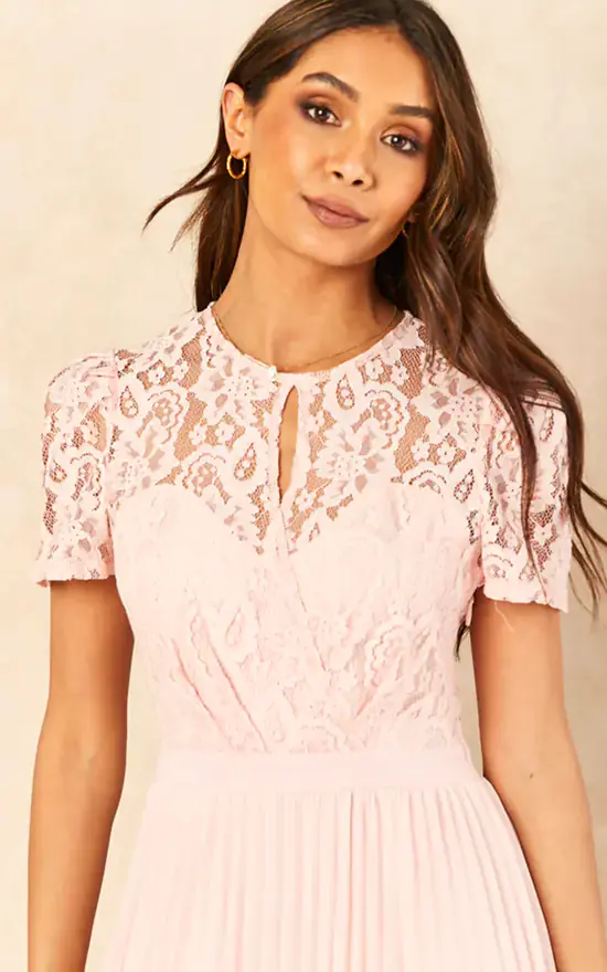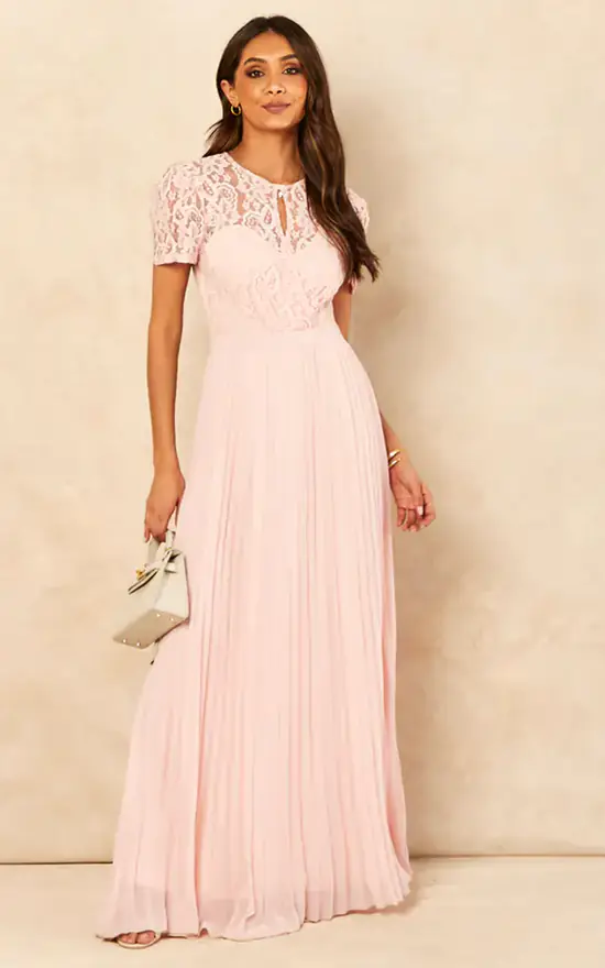 This light pink maxi dress is wedding guest approved and fit for other fancy occasions. It features a wrap front design with keyhole front detail and an invisible zip fastening.