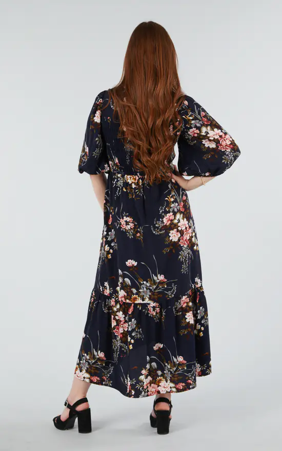 This floral print maxi dress is perfect for casual weekends, your work wardrobe and can also be dressed up for fancier occasions. It boasts an a-line silhouette with elbow length balloon sleeves and a gathered lower tier on the skirt. A high-low hemline, shirred elastic back and a short slit on each side make this dress a cute and comfortable fit.