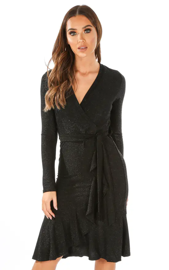 Sparkle your way through this season in the Black Lurex Wrap Midi Dress. Designed from a glitter lurex fabric, this midi dress has a wrap over front with a belted tie, long sleeves and frill egdes on the asymmetric hemline. This dress is perfect for drinks with the girls, finish off your night out look with a pair of metallic strappy heels and a statement necklace.
