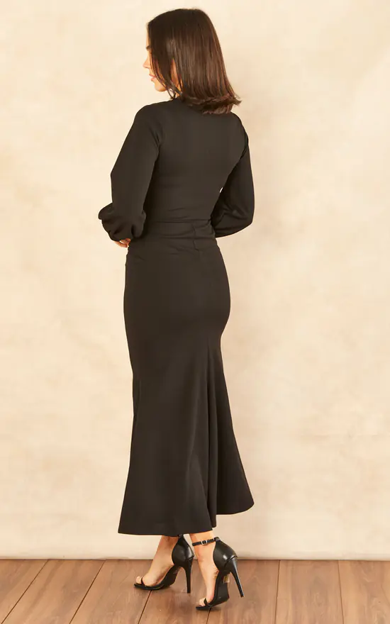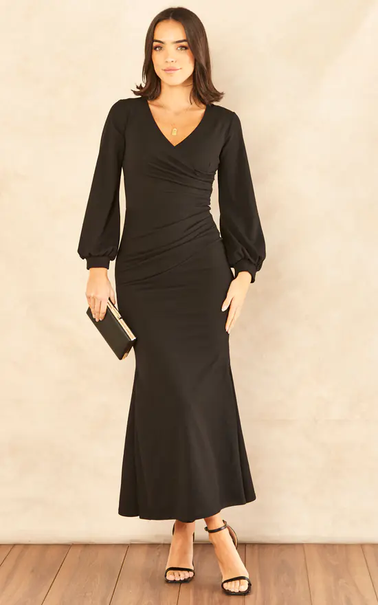 Feverfish long puff sleeve maxi dress featuring front wrap bodice and front rouch detailing, skirt features side pleat details making this a unique and stand out from the crowd design to wear for special occasions.
