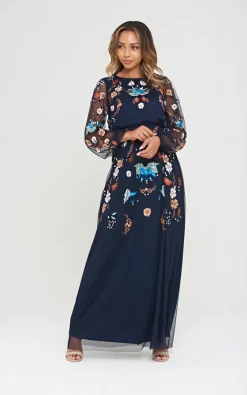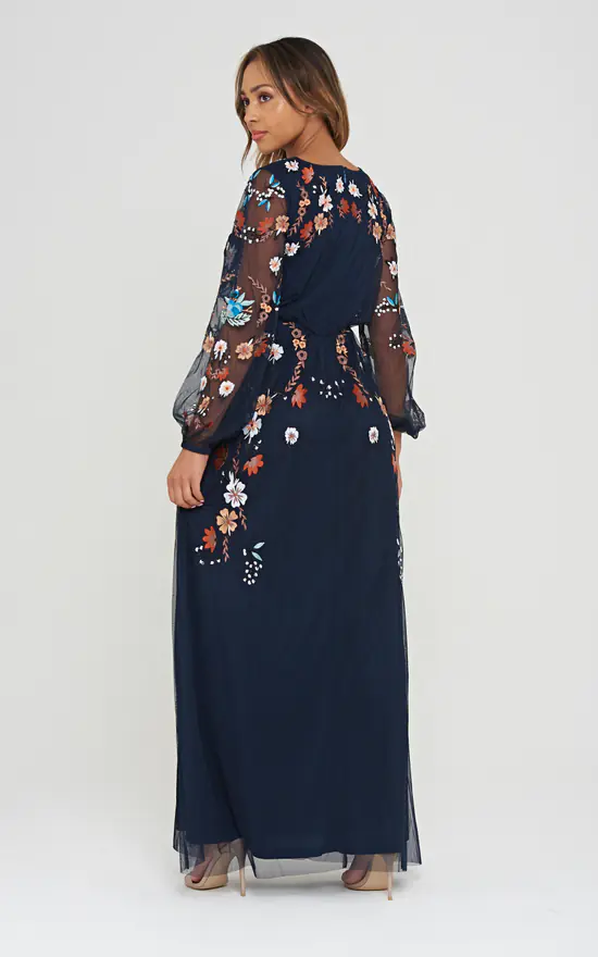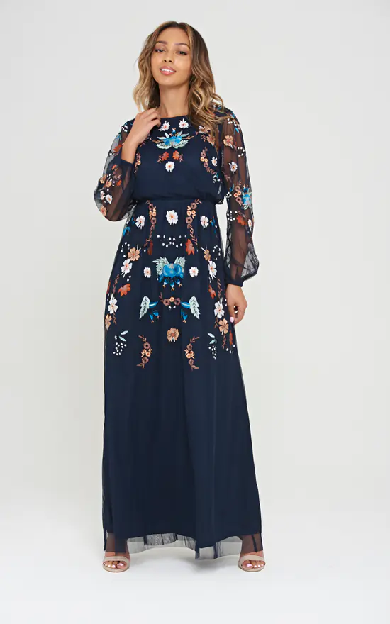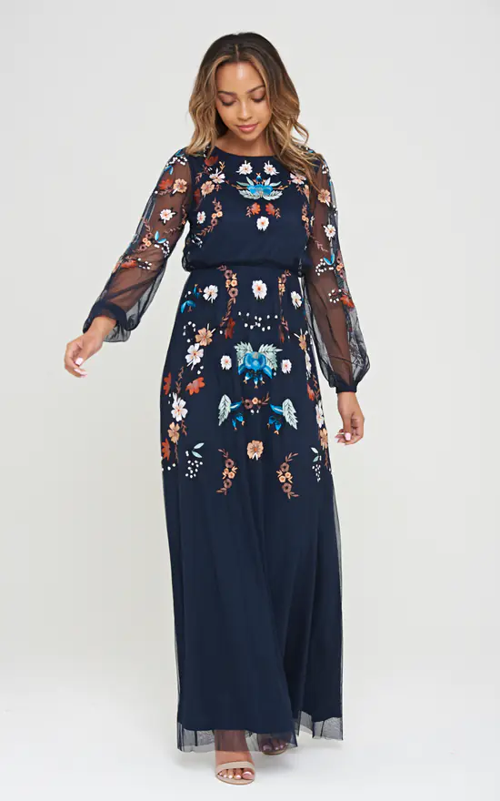 A long navy dress adorned with colourful floral embroidery, Frock and Frill’s Scilla maxi dress is simply stunning. Scilla boasts a full length lining, concealed zip at back and long, sheer sleeves.