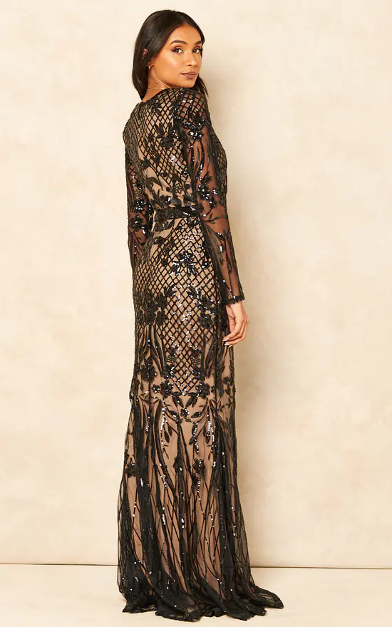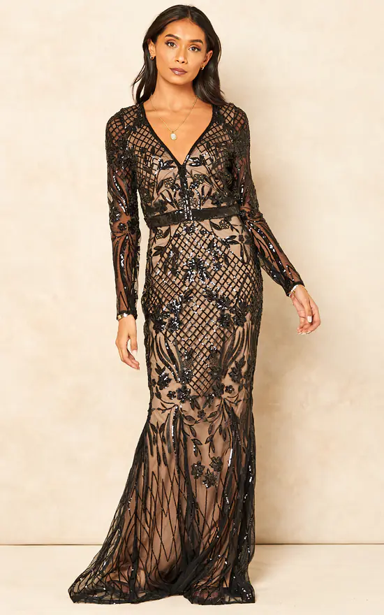 Get ready for the occasion party season in this long sleeve black evening dress. With its mesh sleeves, sequin waistband and sequin embroidery, you will be turning heads without breaking a sweat! This winter warmer is a classic Goddiva staple piece for your evening events. This full sleeve sequin evening dress is the perfect team member for wedding guests, prom, black-tie events and other formal occasions. This sparkling design is also a top tier choice for christmas gatherings and new years celebrations. With its ravishing elegant black colour you canβt go wrong with this sizzling number. The mesh body will flatter your curves and the sequins will add just the right amount of sparkle to your ensemble.