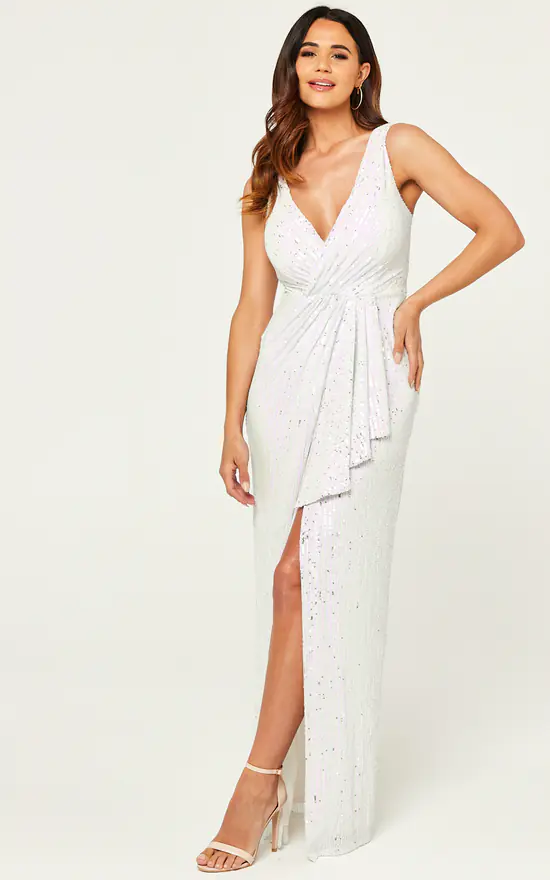 Sultry sequins will never be a thing of the past, well not with Goddiva around anyway. This flawless handkerchief sequin maxi dress with split is the best thing since sliced bread. An award winning choice for your evening occasions, especially in its prize winning creative white colour. Its faux wrap style plunging neckline and sexy front leg split offers a seductive vibe to this already gorgeous dress. Meanwhile, its low square back, sleeveless style with a frill finish on the front of the dress makes this sequin style one of a kind. This sparling long evening is the perfect choice for brides, wedding guests, black tie events, prom, date nights, birthdays and so many other occasions. In its mesmerizing white colour, this evening maxi dress is fool-proof, with its off the charts design and its all over sequin finish this dress can be worn all year around, even for Christmas and new years celebrations.