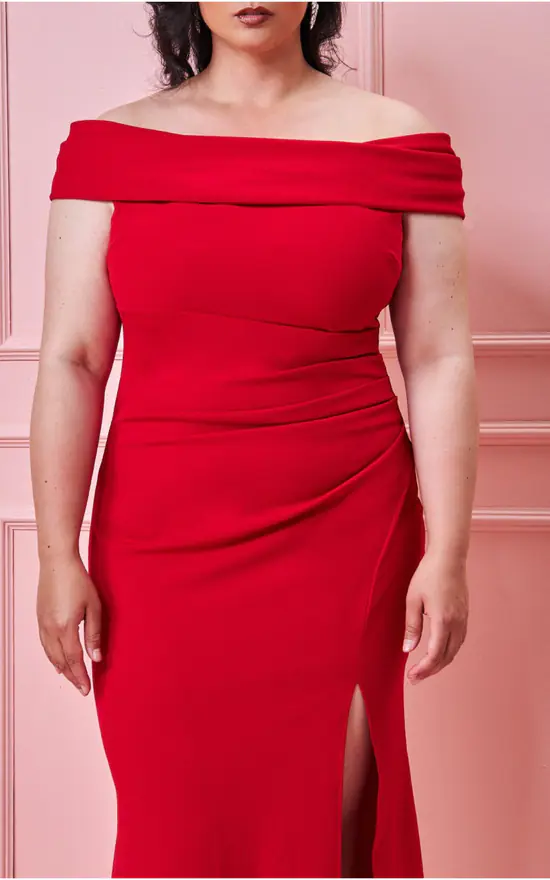 Stand out from the crowd this season in this fiery off the shoulder maxi dress with split. This sexy red number from the Goddiva Plus Collection is your missing piece for your occasion wardrobe. With its darling off the shoulder design, fitted style and flirty split on the leg, this dress will have you feeling fabulous. In its crafty scuba crepe material, this curvy evening dress is a winning choice for bridesmaids, prom, wedding guests, Christmas parties and every special occasion you have coming up. Its floor length skirt offers a sense class and sophistication, while its bardot neckline and split detailing brings a fun a flirty side. This figure flattering evening dress will boost you to show off your sexy silhouette and give you the confidence to strut your stuff, no matter where you are.