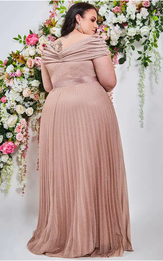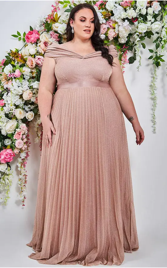This curvaceous blush dress is a timeless classic. It has a flattering cut that flatters every figure and is the perfect go-to for your special day. Off the shoulder style, fitted waist, flowy skirt, shimmery finish – this full-figured maxi dress has it all! This long evening dress has a classic and chic look that will always be in style, perfect as a prom dress in the summer or for bridesmaids for a wedding in any season. Its bardot neckline and shimmery finish makes this plus size style look like something out of a fairy tale. This pink floor length dress with off the shoulder sleeves will be perfect for a fun wedding, prom or black-tie event. Its shimmering luxrex teamed with a satin waistband adds to its beauty and makes this curvy number comfortable enough to wear all night long. The pleated skirt has an A-line shape that skims over any body type. A perfect pick for spring weddings, summer occasions and evening winter black tie gala, this dress is perfect