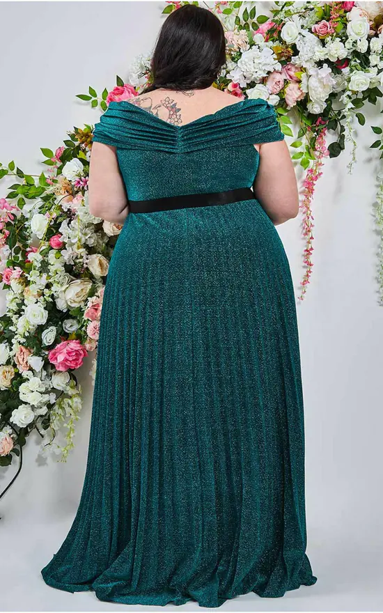 This curvaceous emerald dress is a timeless classic. It has a flattering cut that flatters every figure and is the perfect go-to for your special day. Off the shoulder style, fitted waist, flowy skirt, shimmery finish – this full-figured maxi dress has it all! This long evening dress has a classic and chic look that will always be in style, perfect as a prom dress in the summer or for bridesmaids for a wedding in any season. Its bardot neckline and shimmery finish makes this plus size style look like something out of a fairy tale. This green floor length dress with off the shoulder sleeves will be perfect for a fun wedding, prom or black-tie event. Its shimmering luxrex teamed with a satin waistband adds to its beauty and makes this curvy number comfortable enough to wear all night long. The pleated skirt has an A-line shape that skims over any body type. A perfect pick for spring weddings, summer occasions and evening winter black tie gala, this dress is perfect.