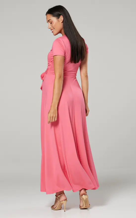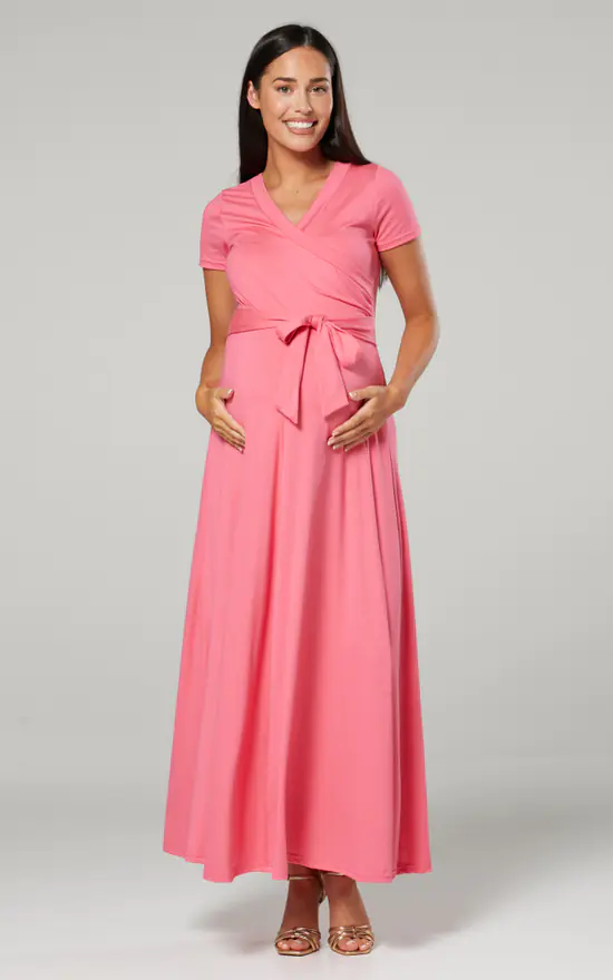 The Perfect maternity and nursing maxi dress in coral finished with a tie at the waist.