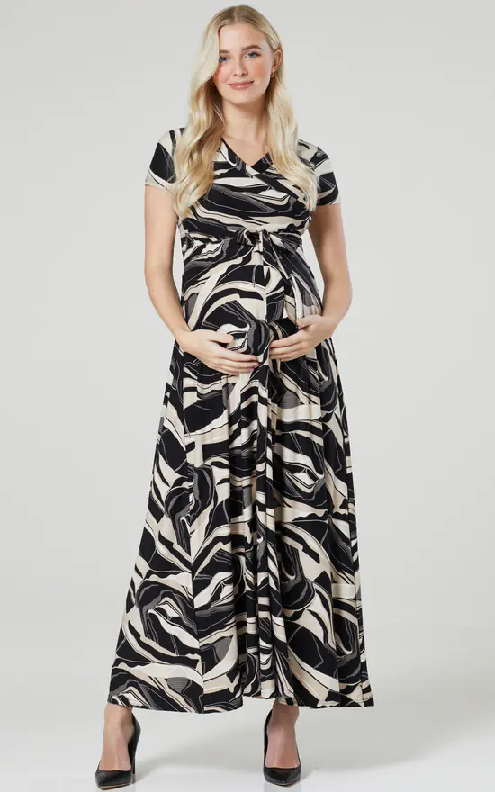 The Perfect maternity and nursing maxi dress in abstract print finished with a tie at the waist.