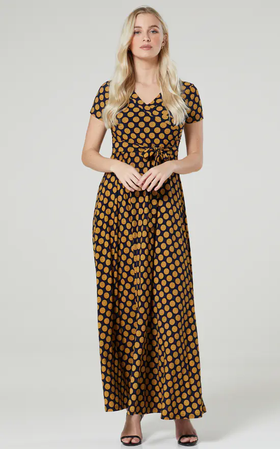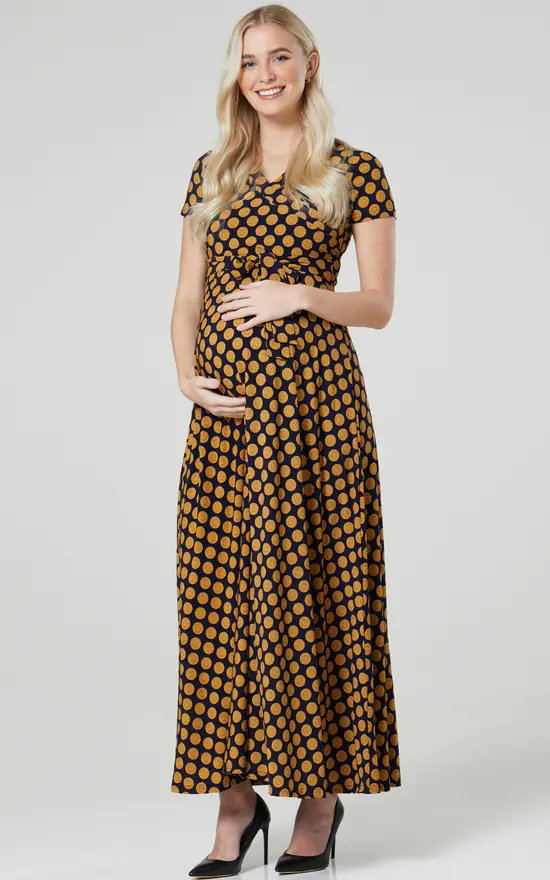 The Perfect maternity and nursing maxi dress in navy with mustard dots finished with a tie at the waist.
