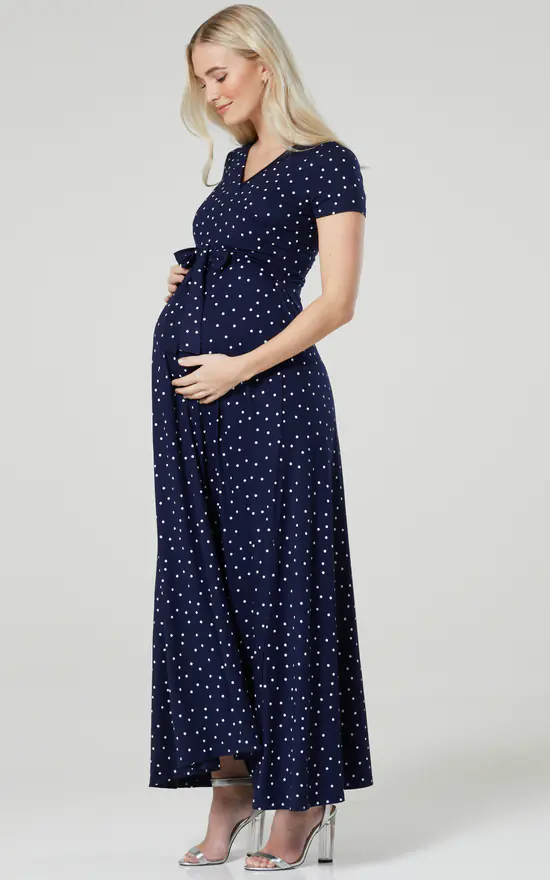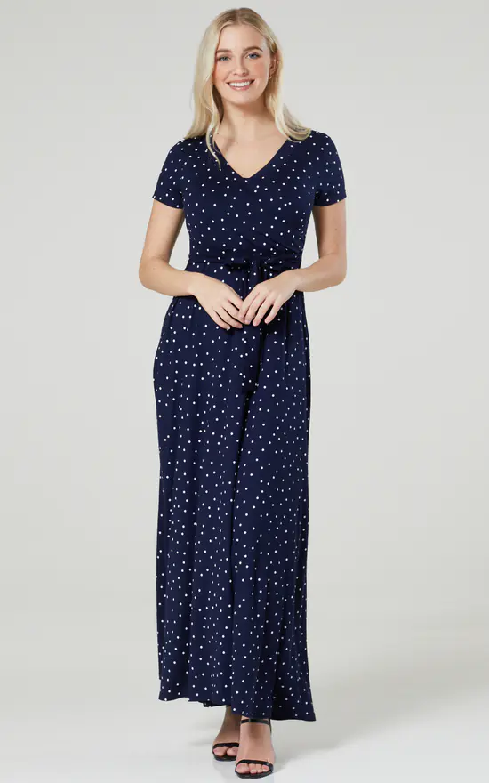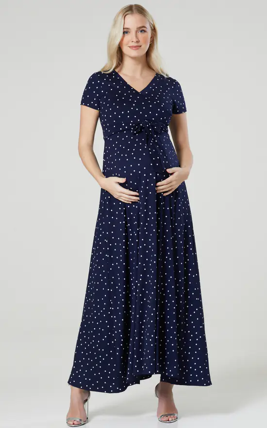 The Perfect maternity and nursing maxi dress in navy with small dots finished with a tie at the waist.