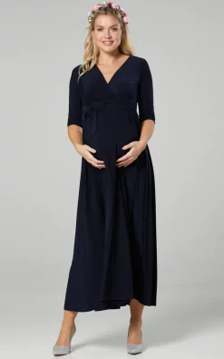 Simple yet elegant, our maternity wedding gown in navy has a light but effective drape to make an unforgettable entrance on your big day. Our classic V-neckline and empire tie waist gown work so well for maternity and breastfeeding. This lightweight and comfortable dress are designed to fit during and after pregnancy.